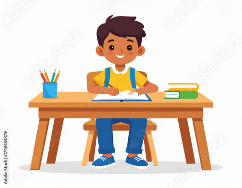 Flat style vector of a child writing in a notebook on a small desk, colorful