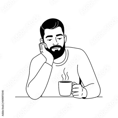 flat, style, vector, illustration, man, beard, leaning, hand, holding, steaming, mug, simple, line, minimalist, design, black, white, smooth, curve, clean, edge, isolated, background, inspired, modern