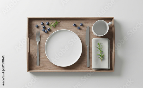 rustic, breakfast, blank, food photography, topview, overhead, minimalist, clean, modern, aesthetic, high-quality, morning, copy space, cutlery, fork, knife, napkin, rosemary, blueberry, healthy eating, simple, elegant, natural, light, cosy, stylish, serving, one object, landscape, white background, still life