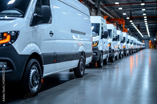 Fleet of delivery vans parked in a modern warehouse facility ready for dispatch to various locations