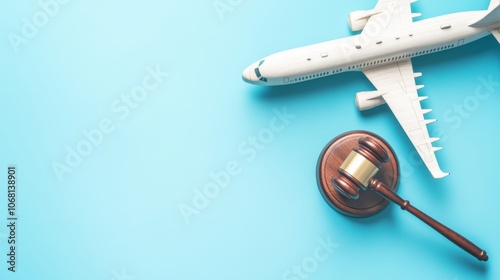Flight cancellation aviation law sue airline company concept wooden judge gavel on airplane model on blue background