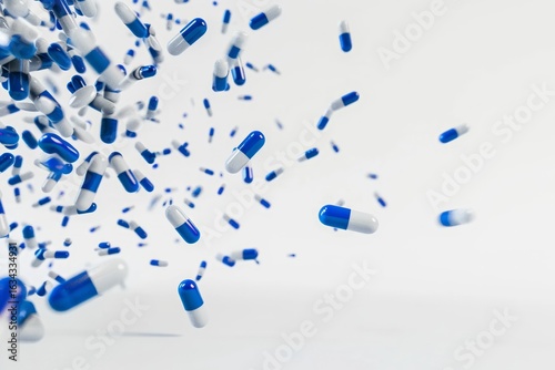 capsule, blue, white, floating, motion, abstract, pharmaceutical, innovation, dynamic, medicine, pill, health care, science, technology, treatment, health, vibrant, energy, movement, gravity, levitation, futuristic, modern, clinical, chemistry, dosage, prescription, aesthetic, design, micro, macro, aethereal, progress, laboratory, sterile, digital, concept, kinetic, ai, artificial intelligence