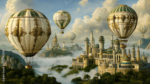 city, floating, hot, air, balloon, fantasy, landscape, cloud, scenic, aerial, view, travel, adventure, dream, earth, imagination, majestic, castle, palace, kingdom, serene, peaceful, scenery, exploration, artistic, colourful, vibrant, art, digital, painting, illustration, surreal, whimsical, gorgeous, beauty, picturesque, nature, flying, destination, escape, wonder, idylli