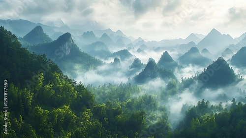 Floating Clouds Over Misty Mountain and Deep Green Forest high resolution hd picture