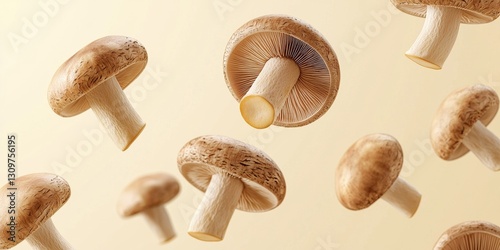 Floating cremini mushrooms with smooth brown caps on a light yellow background