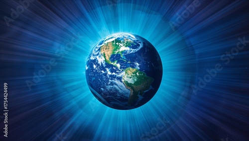 Floating planet Earth revealing clouds in outer space, with blue radial beams and distant stars
