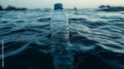 Floating plastic water bottle in ocean waters at dusk creates awareness of marine pollution