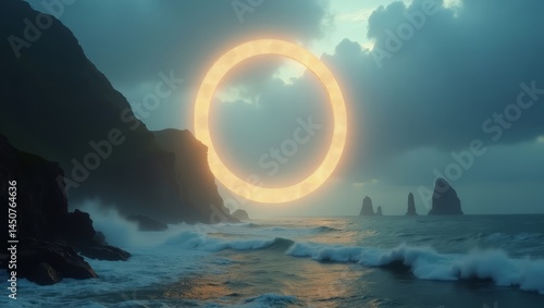 ocean, cliff, portal, glowing, ring, fantasy, surreal, stormy, water, mist, floating, epic, cinematic, crashing waves, dreamlike, golden light, dramatic, magic, fisheye, escape, no people, atmospheric