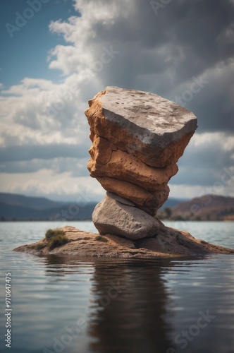 Floating Rock Formation with a Concrete Top in a Cloudy Sky.