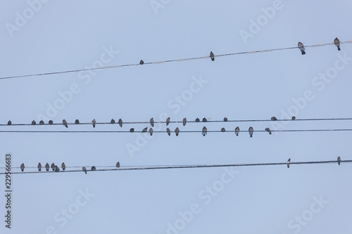 bird, animal, wire, sky, line, flock, nature, sitting, row, freedom, colours, wildlife, blue, winter, snow, frost, cold