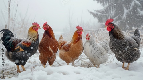 chicken, snow, winter, farm, feather, red, comb, snowfall, stable, tree, frost, cold, white, nature, agriculture, poultry, flock, group, outdoors, rural, season, weather, climate, survive, animal, country, warm, cool, agricultural, habitat, way of life, creature
