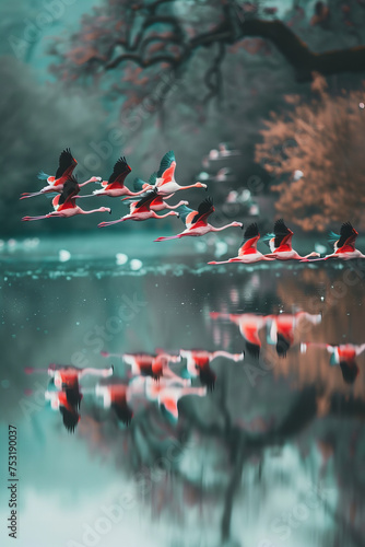 Flock of Flamingos in Harmonious Flight over Serene Waters - Banner