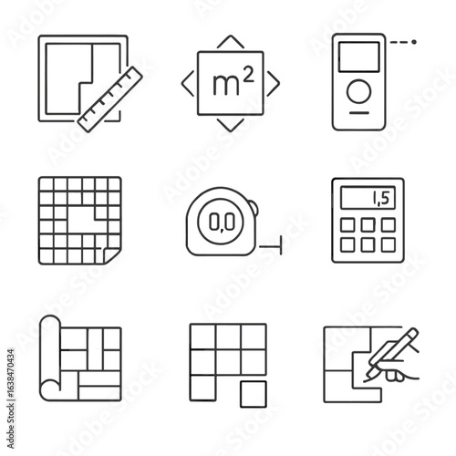floor, plan, icon, outline, style, flooring, measurement, planning, with, ruler, area, calculation, icon, laser, measurer, tool, grid, paper, layout, digital, tape, measure, square, footage, calculating machine, blueprint
