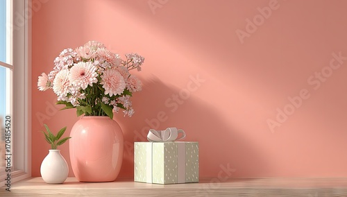 flower, vase, gift, box, present, floral, arrangement, pink, pastel, still life, window, light, shadow, soft, tender, romantic, pretty, bloom, blossom, bouquet, decoration, decorative, design, stylish, elegant, minimal, simple, clean, modern, contemporary, interior, indoor, table, surface, object, item, aesthetic, calm, peaceful, serene, white, close, closeup, detail, studio, gentle, sweet, lovely