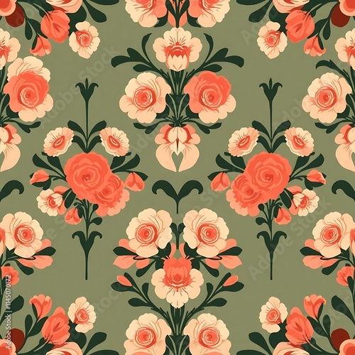 Floral Damask Seamless Pattern: Elegant coral and peach roses on a sage green background. Perfect for textile design, wallpaper, and various print applications.