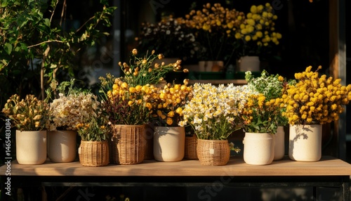 flower, bouquet, potted, plant, arrangement, display, shop, market, gardening, nature, vibrant, colourful, yellow, white, brown, rustic, decor, home, beautiful, fresh, floral, spring, summer, autumn, fall, pottery, container, garden, organic, decorative, artisanal, design, freshness, beauty, natural