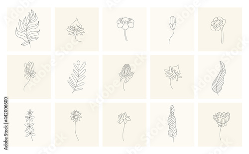 Floral elements. Collection of hand drawn plants. Set design elements in sketch style flowers and branches. Botanical icons