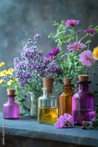 flower, bottle, aromatherapy, fragrance, herbal, natural, beauty, wellness, spa, purple, yellow, pink, cosmos, wildflower, botanical, glasses, cork, liquid, medicine, remedy, health, well-being, organic, plant, floral, nature, alternative, therapy, relaxation, calm, serenity, ingredient, perfume, scent, aroma, vintage, rustic, still life, background, image, photo
