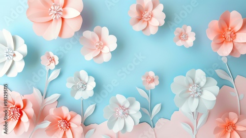 Floral frame background of Plain light blue paper structure background with blank copy space in the middle, on top of the background are smller and bigger daisy blossoms scatterd arround