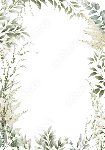 Floral frame, Greenery, Greeting card with foliage, can be used as invitation card for wedding, birthday and other holiday and summer background. Botanical art.