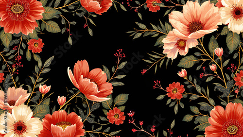 Floral kimono fabric pattern on a black background The design features a rich array of red and cream blossoms with gold accents