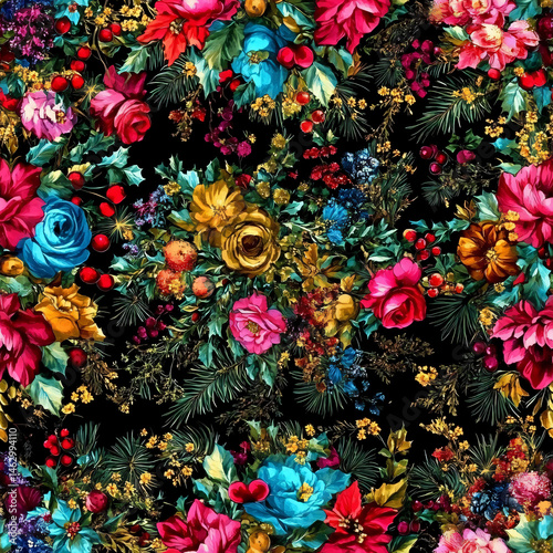 floral, pattern, vibrant, colours, flower, rose, blue, red, yellow, pink, green, botanical, design, greenery, nature, dark, black, background, print, decoration, artwork, texture, beautiful, posh, lush, bright, exotic, ornamental, abstract, display, arrangement, spring, seasonal, visual, colourful, blooming, festive, delicate, lively, cheerful, intricate, style, textile, aesthetic, traditional, classic