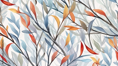 Floral seamless pattern, multicolored Weeping Willow leaves on light grey background Generative AI