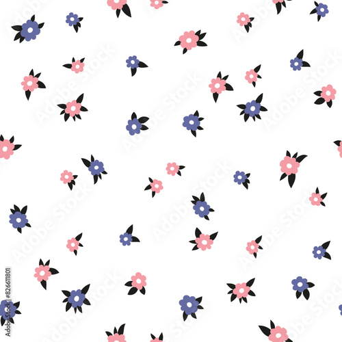Floral seampless vector pattern. Pretty bright flowers on white background. Meadow simple boho texture. Printing with small colorful flowers.