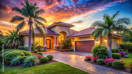 sunny day, vivid colors, landscaping, plant, palm tree, ocean view, waterfront, vacation home, luxury home, residential, property, estate, modern architecture, house for sale, sunny, bright, exterior, photorealistic, detail, depth of field