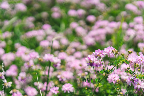 Flower background, beautiful multi-colored wildflowers illuminated by the sun, beautiful bokeh and a place for copyspace, Meadow with lots of spring flowers