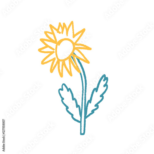 Flower crayon drawn. Spring daisy plant doodle isolated on white background. Summer floral kids element. Chalk or pastel style childish wildflower nature shape. Vector naive illustration by pencil.