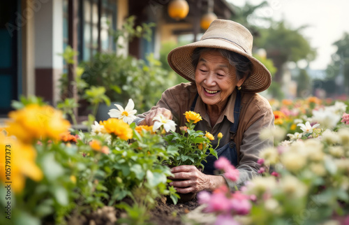 Flower greenhouse for growing flowers, smiling elderly Asian wom