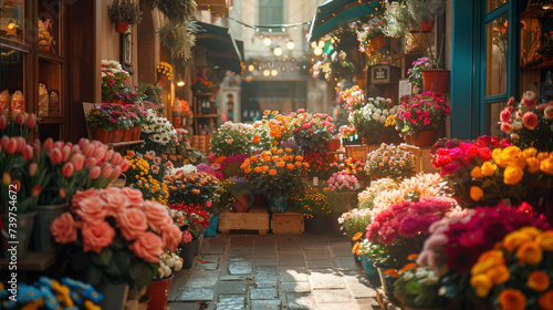 Flower shop adorned with an abundance of colorful flowers on display, inviting passersby into the cozy botanical haven.