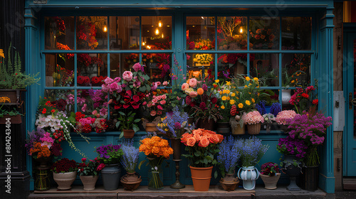 flower shop window overflows with lush, beautifully arranged bouquets