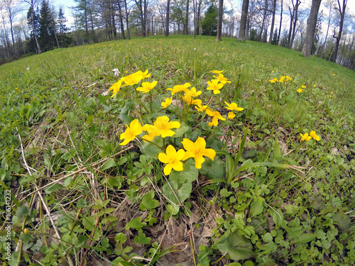flowering marsh marigold (Caltha palustris) blooms on a meadow..