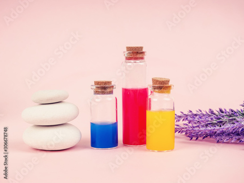 Flowers and plant extracts or perfume in small bottles on pink background. three small bubbles with red blue and yellow liquid, the concept of experiments and research. Space for text.