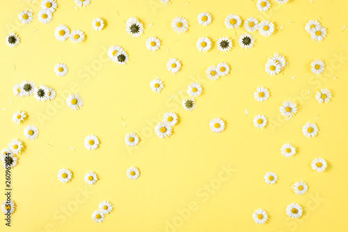 Flowers composition. Chamomile flowers on pastel yellow background. Spring, summer concept. Flat lay, top view, copy space