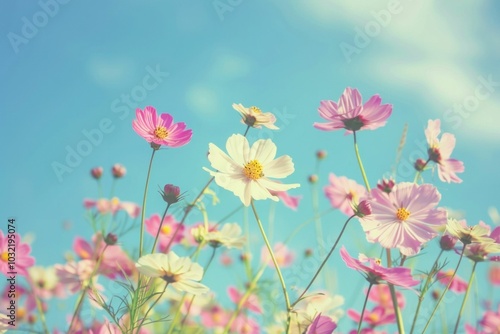 flowers, nature, spring, summer, blooming pastel cosmos flowers against blue sky background, bright and cheerful scene, evoking feelings of joy and tranquility, vibrant garden atmosphere