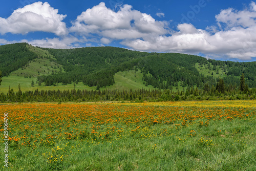 flower, orange, meadow, green, emerald, grass, mountain, sky, blue, cloud, forest, snow, yellow, vale, rural, amazing, vibrant, sunny, field, landscape, nature, summer, background, blossom, bloom, wildflower, light, scenic, herb, bright, beautiful, altai, hill