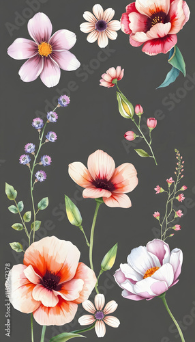 flower, watercolor, illustration, composition, element, floral, hand-painted, botanical, colourful, artistic, decorative, nature, garden, bouquet, leaf, bloom, vibrant, delicate, beautiful, hand-drawn, design, isolated, collection, background, decoration, art, painting