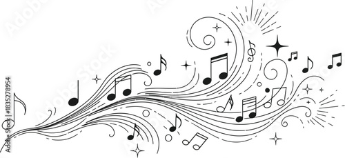 Flowing musical notes and swirls create a dynamic and artistic composition