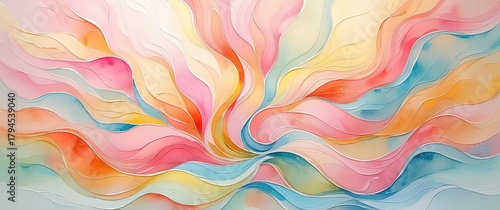 Flowing pastel illustration: soft pinks, oranges, yellows, and blues in petal/wave-like strokes radiate from the center, creating a delicate, fluid, painterly texture.