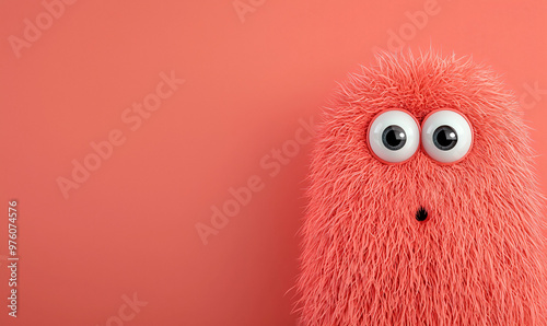 Fluffy and vibrant, this big eyed furry monster blinks in surprise against coral background, evoking sense of wonder and curiosity