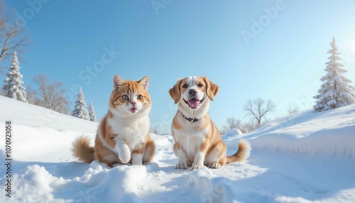 animal, cat, dog, winter, snow, fluffy, playful, hillside, blue, sky, sunlight, warmth, fur, cold, scene, pet, joyful, serene, companionship, nature, fun, snowdrift, closeup, landscape, friends, happiness, furry, adorable, clear, pet, fresh, bright, calmness, beauty, cuteness, winter landscape, play, interaction, wildlife, animal, puppy