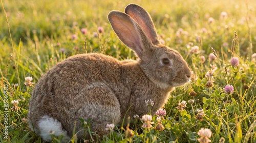 rabbit, rabbit, flemish, giant, animal, wildlife, nature, outdoors, field, grass, clover, flower, pet, mammal, cute, adorable, fluffy, fur, ear, long, brown, grey, beige, soft, gentle, peaceful, calm, serene, sunlight, gold, warm, light, evening, dusk, dawn, meadow, pasture, rural, countryside, habitat, wild, domestic, breed, portrait, side, profile, closeup