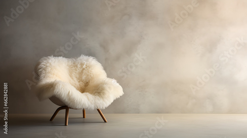 Fluffy fur sheepskin lounge chair on shaggy rug against venetian stucco wall with copy space. Minimalist home interior design of modern living room