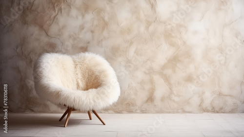 Fluffy fur sheepskin lounge chair on shaggy rug against venetian stucco wall with copy space. Minimalist home interior design of modern living room Generative AI