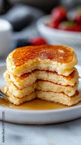 Fluffy homemade pancakes stack with syrup drizzle on white plate. National Pancake Week