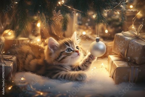kitten, cat, animal, fluffy, christmas, tree, bauble, pet, cute, christmas, pet, felino, domestic, young, cat, decoration, santa, celebration, silver, festive, cosy, playful, gift, decoration, light, holiday, warm, charming