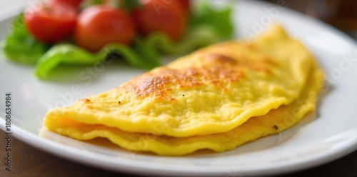 Fluffy Omelette Perfection A perfectly cooked, golden brown omelette with a soft, fluffy, pale yellow interior, glistening slightly, presented on a clean white plate. Soft, natural light. Close up,